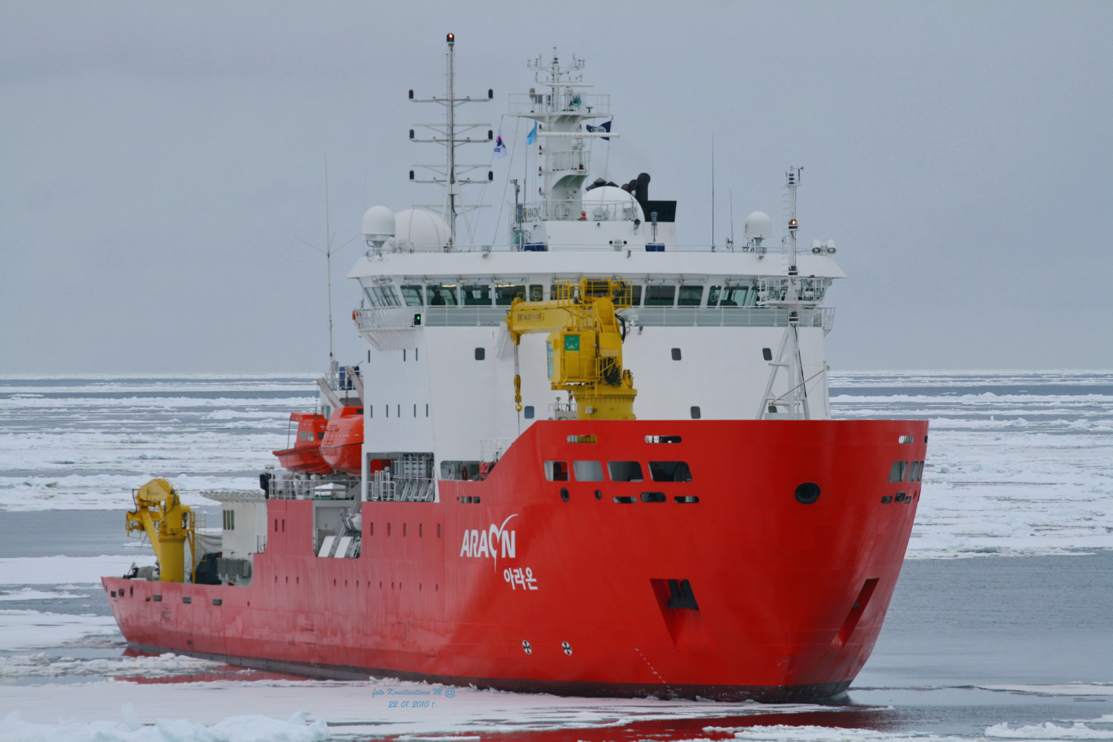 В 2009 году в Южной Корее построено первое НЭС ледового класса Araon. Оно снабжает корейские антарктические станции King Sejong и Jang Bogo, а также выполняет исследовательские рейсы в Арктику. Судно имеет водоизмещение около 7500 т, длину около 109,5 м, ширину 19 м. Два азимутальных движителя обеспечивают судну ледопроходимость 1 м при скорости 2 узла. Судно способно принять 15 контейнеров в трюм и 31 на палубу. Численность экспедиции — до 60 человек.