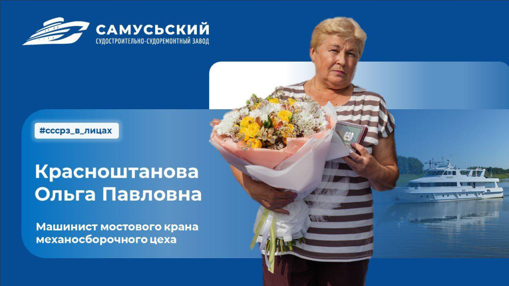 Уже 40 лет Ольга Павловна Красноштанова работает машинистом мостового крана на Самусьском ССРЗ. Свой путь на предприятии она начала в 1986 году с полугодового обучения на курсах машинистов и окончательно влюбилась в профессию. Более 30 лет проработала в судостроительном цехе, а сейчас трудится в механосборочном.