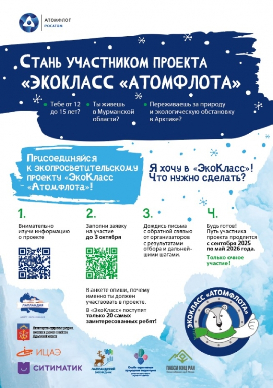 ФГУП "Атомфлот" приглашает школьников на 3-ю смену экологопросветительского проекта "Детско-юношеское волонтерское движение "ЭкоКласс "Атомфлота". Прием заявок заканчивается 3 октября 2025 года.
