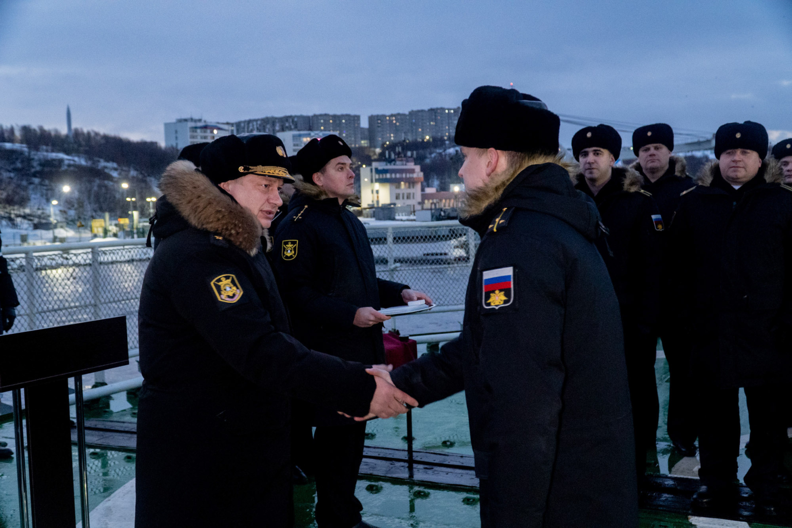 Доклад командира корабля об успешном завершении похода принимал начальник штаба Кольской флотилии разнородных сил Северного флота контр-адмирал Олег Гладкий. От имени командующего Северным флотом адмирала Константина Кабанцова он поблагодарил моряков за профессионализм и высокие результаты, а также поздравил их с возвращением домой.
