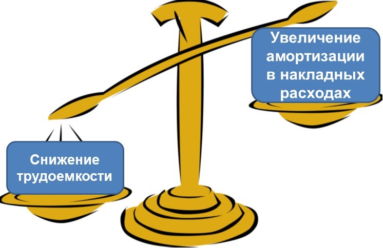 Перейдем к стадии строительства и оценим, как внедрение новых технологий и инвестиции в развитие производства сказываются на стоимости строительства судна. На рисунке ниже эта зависимость представлена в виде весов: на одной чаше — снижение трудоемкости, на другой — увеличение амортизации в накладных расходах. Мы, как оптимисты, будем рассчитывать, что здесь «перевесит» снижение стоимости строительства.
