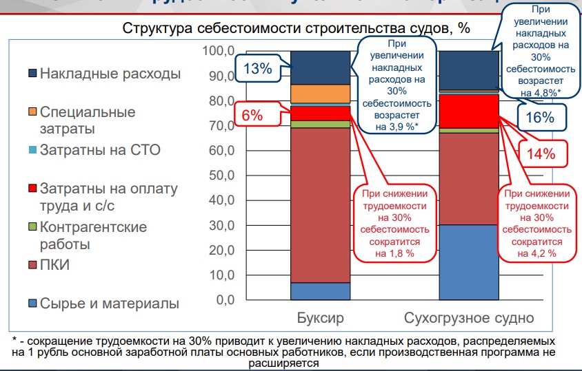 Рассмотрим структуру цен для двух типов судов. Первое — это буксир, технически сложное судно, второе попроще — сухогруз. Снижение трудоемкости строительства судна оказывает прямое влияние на затраты на оплату труда и социальные отчисления. На буксире этот пункт составляет 6% от себестоимости, у сухогруза — 14%. Если мы снизим трудоемкость на 25–30% или даже наполовину, то себестоимость снизится, соответственно, на 2% или 4%, — эти значения, по сути, в пределах погрешности. Основной вклад в цены судов, в том числе в рост цен, вносит СКО. Но об этом поговорим не сегодня. Сейчас рассмотрим стоимость собственных работ судостроительного завода.
