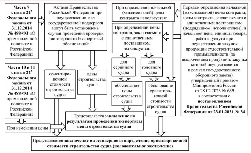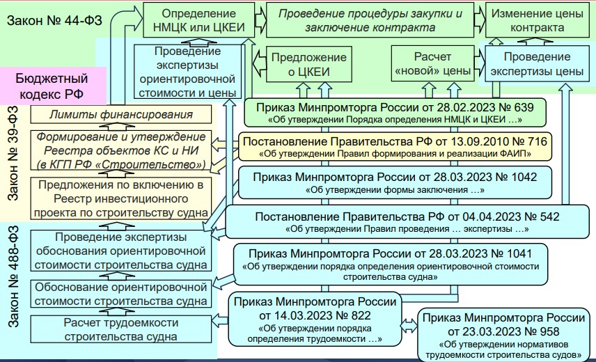 Минпромторгу также предоставлены полномочия утверждать порядок определения трудоемкости (приказ №822), порядок определения ориентировочной стоимости строительства судна (приказ №1041), форму заключения по экспертизе ориентировочной стоимости (приказ №1042) и нормативы трудоемкости (приказ №958). Все полномочия по нормативно-правовым актам, предоставленные законом, были реализованы, и эти акты вступили в силу одним блоком также в апреле 2023 года.