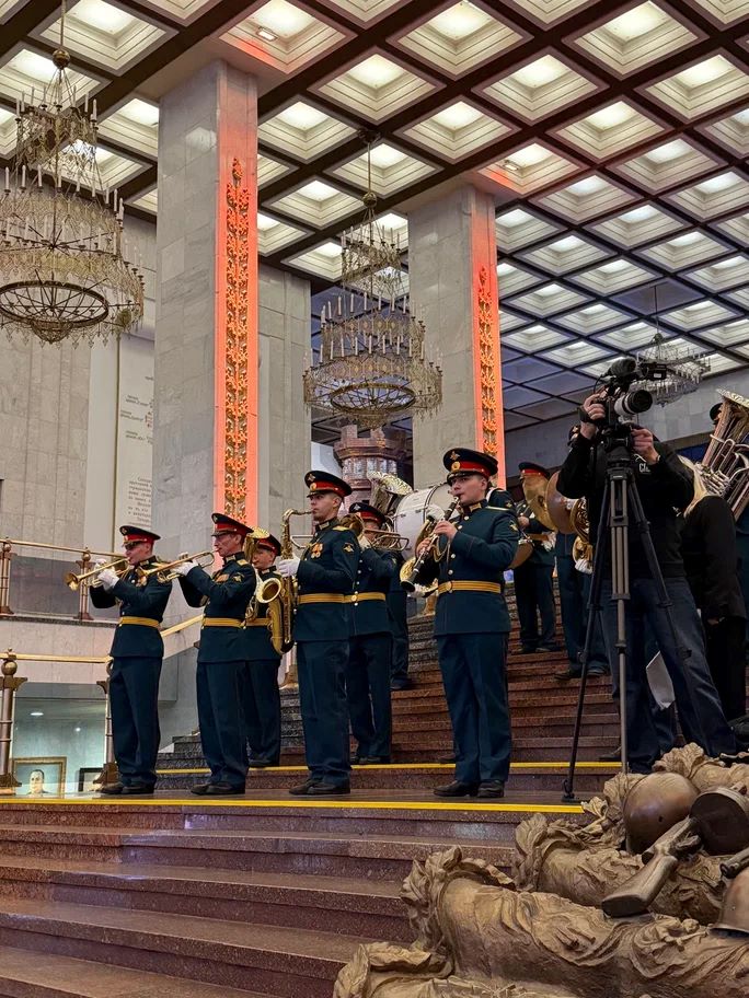 В Основном зале гостей встретил оркестр Московского Военного Округа церемониальными фанфарами и выносом Государственного флага Российской Федерации.