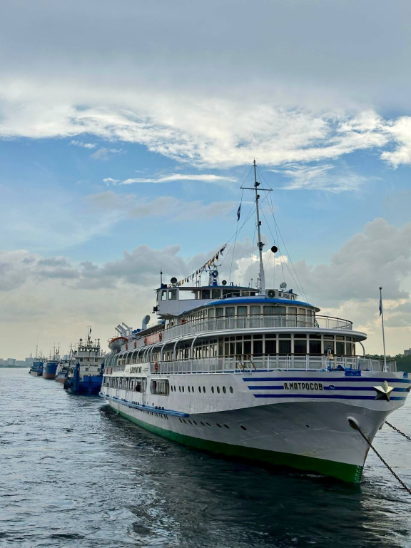 В акватории Енисея выстроились суда, украшенные флагами расцвечивания. На теплоходе "Чайка" представители органов власти и руководители предприятий совершили обход судов, стоящих в парадном строю, и поздравили с профессиональным праздником экипажи, которые отозвались троекратным "Ура!".