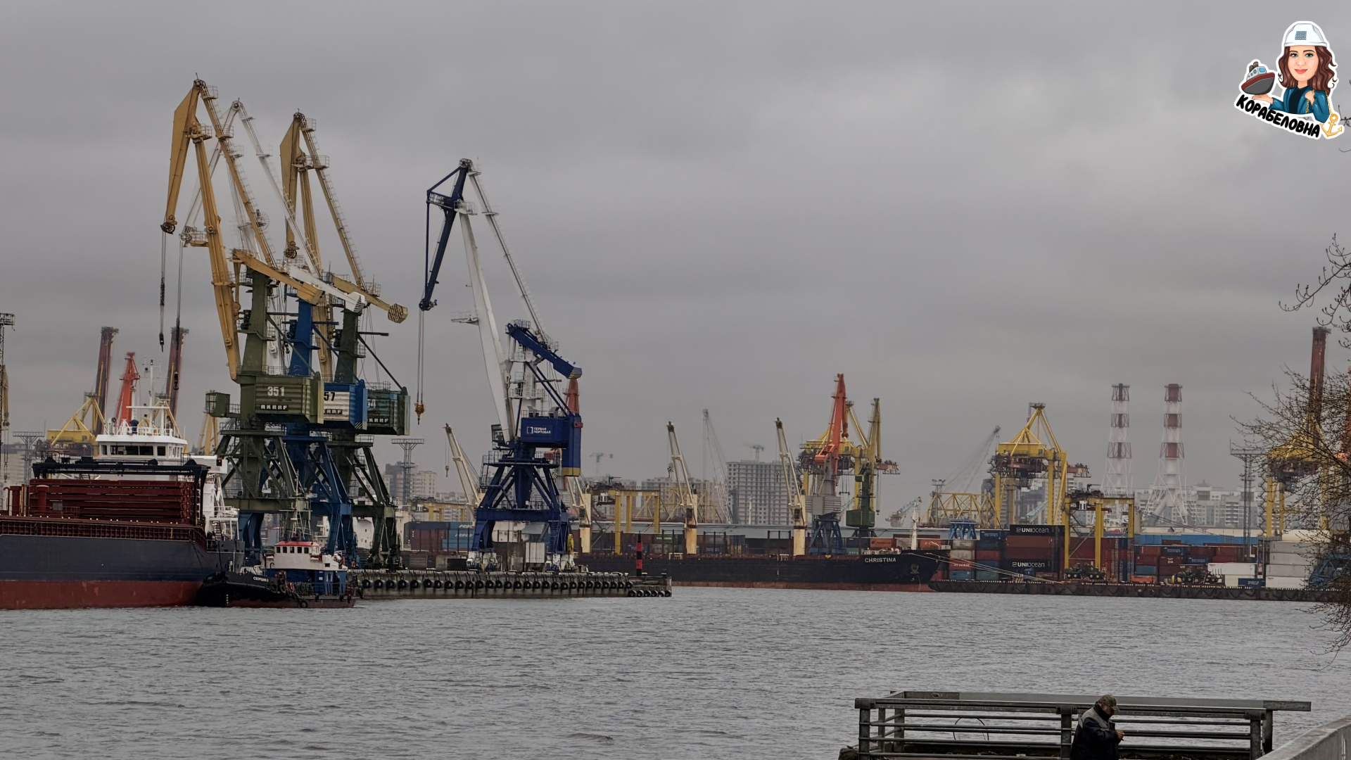 Оттуда открываются редкие ракурсы на Морской порт: в объектив попали могучие доковые сооружения КСЗ, грузовые суда, краны и неожиданный гость — пассажирское судно, которое готовится к своей навигации.