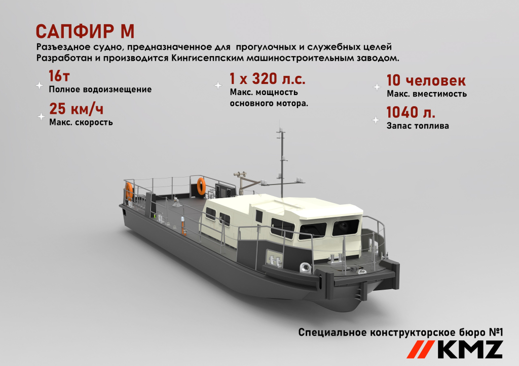 Катер "Сапфир-М" может перевозить до 10 человек и 2500 кг груза. Дизельный двигатель мощностью 320 л.с. и водометный движитель позволяют развивать скорость до 25 км/ч. Прочный стальной корпус длиной 14 и шириной 3,65 метра позволяет вести работы при высоте волн до 1,2 м. Водоизмещение катера — 16 тонн.