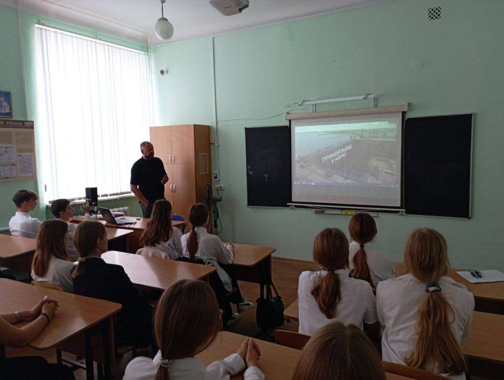Представитель Судостроительного завода им. Б.Е. Бутомы, ведущий специалист по профориентационной работе Владимир Чичиланов, провел профориентационную встречу с учениками 9 класса Морского Технического Лицея.