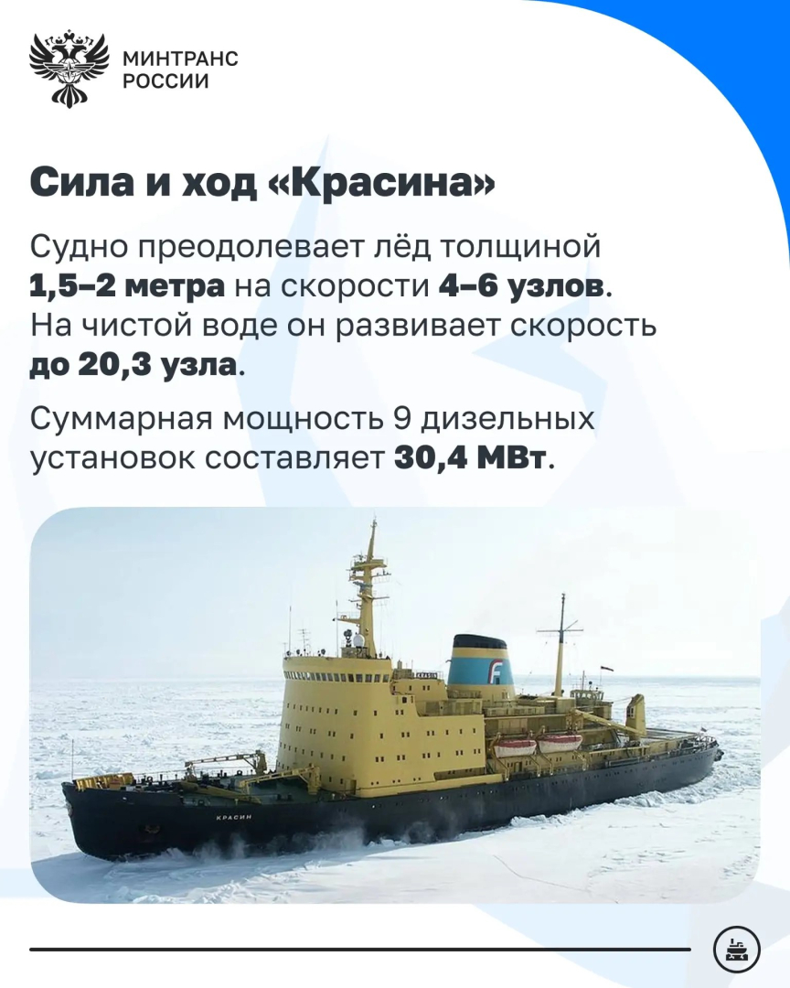 «Красин» способен преодолевать льды толщиной 1,5 — 2 м на скорости 4 — 6 узлов. А скорость на чистой воде достигает 20,3 узла. Суммарная мощность 9 дизельных установок ледокола составляет 30,4 МВт.
