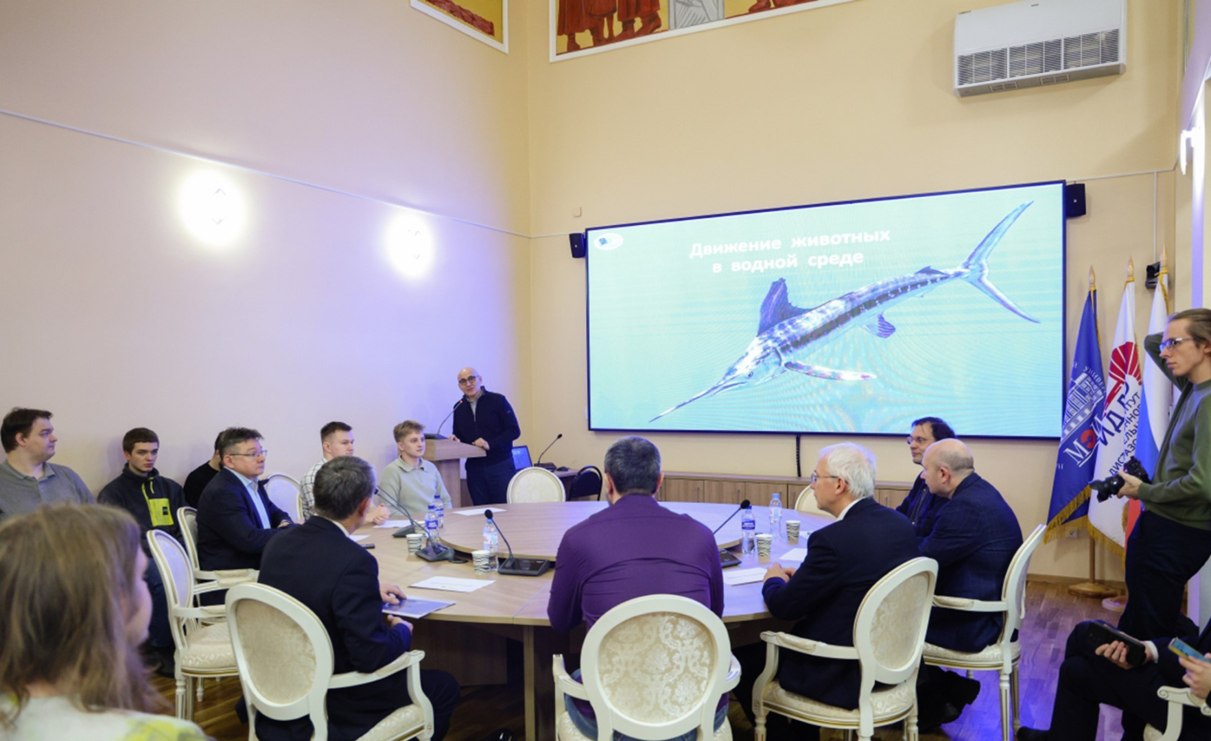 Основу профессиональной дискуссии заложили два фундаментальных доклада. Доктор биологических наук Вячеслав Бизиков в своем выступлении «Движение животных в водной среде» представил анализ эволюции локомоции у различных групп водных организмов — от головоногих моллюсков до морских млекопитающих. Ученый подробно остановился на разнообразии стратегий плавания, механизмах поддержания плавучести и на явлении глубокой конвергенции. На примере ихтиозавров, акул и дельфинов он показал, как водная среда формирует фундаментальные ограничения и приводит к оптимизации форм и движений, что крайне важно для инженерного проектирования.