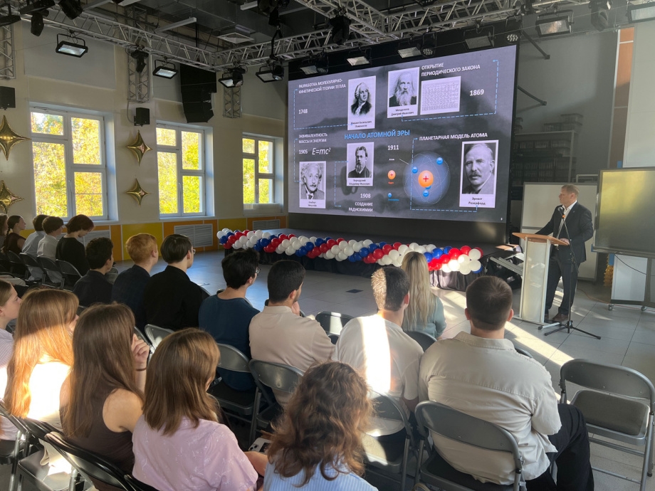 Глава Машиностроительного дивизиона "Росатома" Игорь Котов и заместитель руководителя Машиностроительного дивизиона "Росатома" по операционной деятельности Максим Тюкавкин рассказали ученикам 10-11 классов инженерных корпусов "Альфа" и "Гамма" московской школы № 1502 "Энергия" о прошлом, настоящем и будущем атомной отрасли. Встреча со старшеклассниками прошла в рамках всероссийской инициативы "Разговоры о важном", посвященной 80-летию отечественной атомной промышленности.