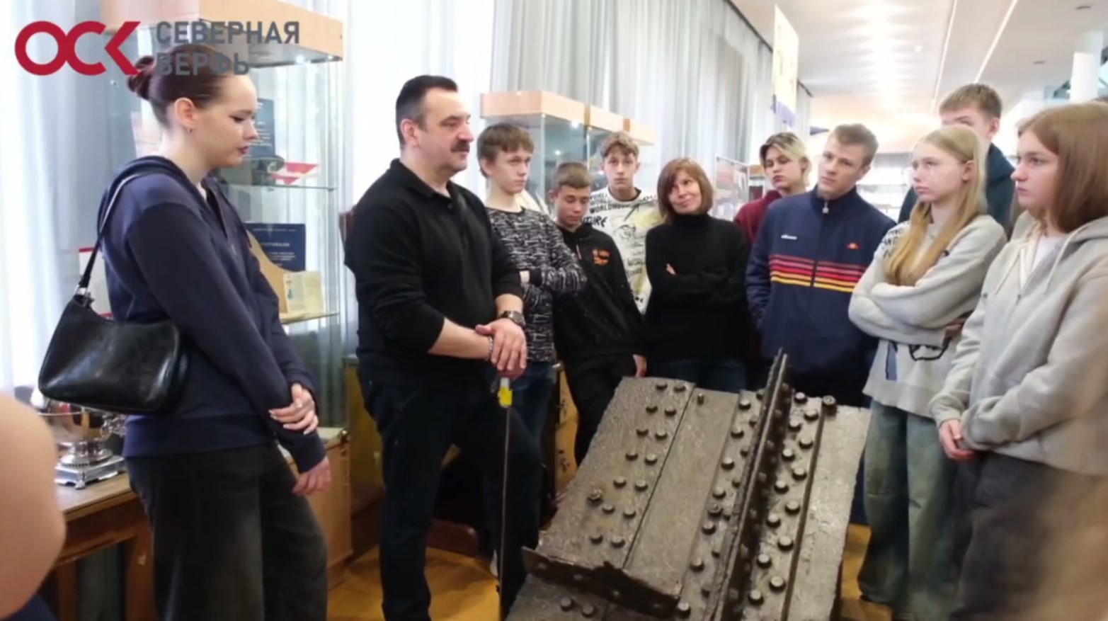 Экскурсия началась с увлекательного рассказа об истории зарождения знаменитого завода, а также о ключевых этапах судостроения, таких как процесс клепания. Школьники узнали, как жили и трудились люди, посвятившие себя этому непростому, но важному делу.