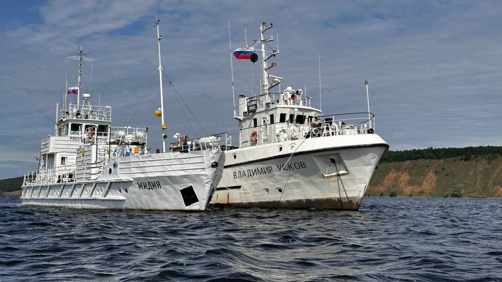 Параллельным курсом с НИС "Мидия" следовало судно "Владимир Усков", на котором продолжалась плановая весенняя экспедиция по водным объектам зоны ответственности.