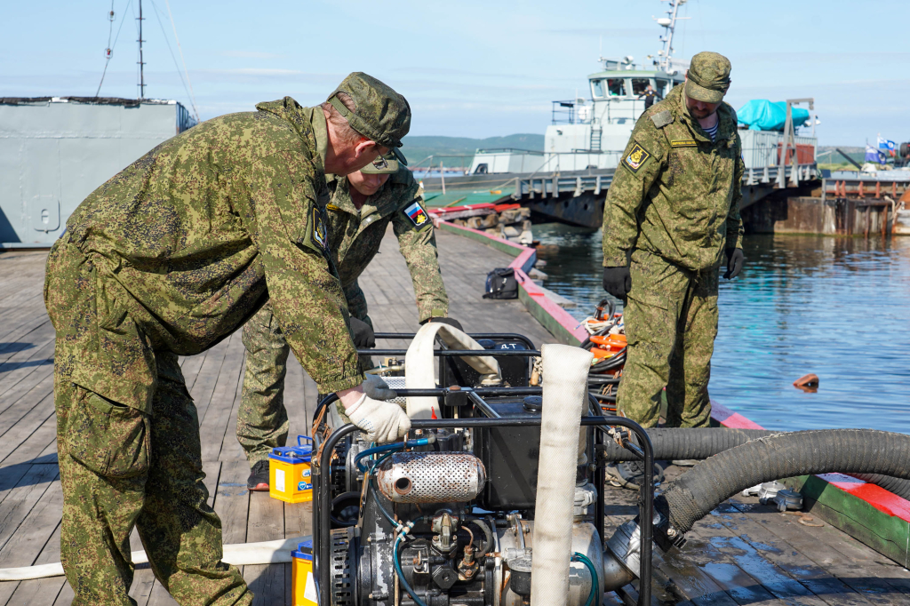 В завершении мероприятия с рейдового водолазного катера "РВК-1230" под воду были спущены водолазные группы. Находясь под водой, водолазы провели разведку повреждений корпуса и заделали пробоины клиньями с установкой специальных пластырей.