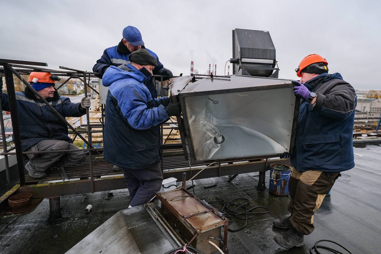 На предприятии заменяют старые ртутные прожекторы на современные светодиодные.