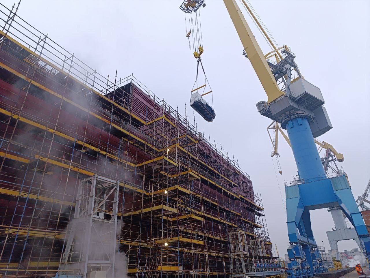 Специалисты» Балтийского завода» ОСК погрузили резервный дизельный генератор (РДГ) на левый борт строящегося универсального атомного ледокола «Ленинград». Агрегат весом 38,5 тонн и мощностью 2000 кВт установлен на штатное место при помощи портального крана.