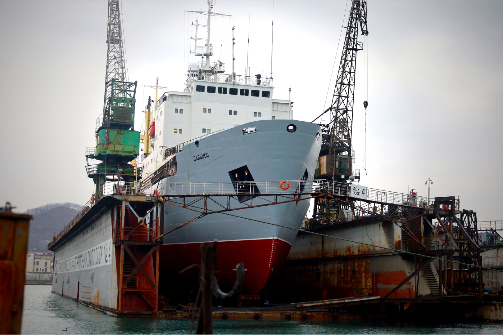 В доке №4 ООО «Судоремонтный комплекс — Приморский завод» завершен плановый промежуточный ремонт плавбазы «Дальмос», принадлежащая ООО «Поллукс».