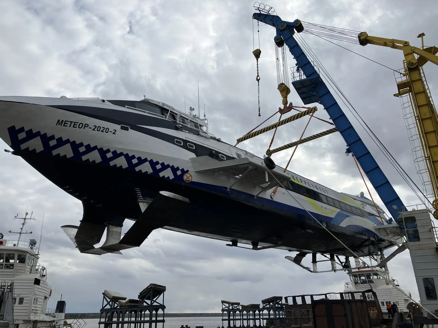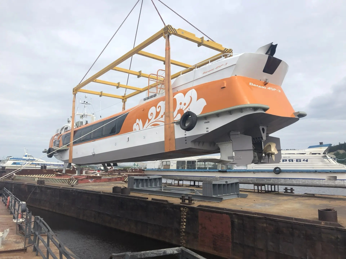 — Перепад воды в регионе очень большой — 8,5−9 м, поэтому мы поднимаем эти суда не на берег, а на специальную баржу. У нас есть кран, который выполняет эту операцию и ставит суда на стапельные подставки с помощью судовой команды. На барже, как правило, размещаем два «Метеора» и два маленьких судна.