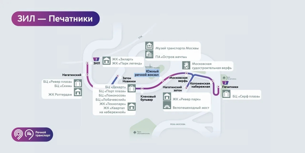 В зоне притяжения нового маршрута проживает около 700 тыс. москвичей. Суда проходят более чем через шесть жилых кварталов, а также связывают пассажиров с ключевыми достопримечательностями: Южным речным вокзалом, парком аттракционов «Остров мечты», Коломенской и Нагатинской набережными, сообщает МАХ-канал Дептранс Москвы.
