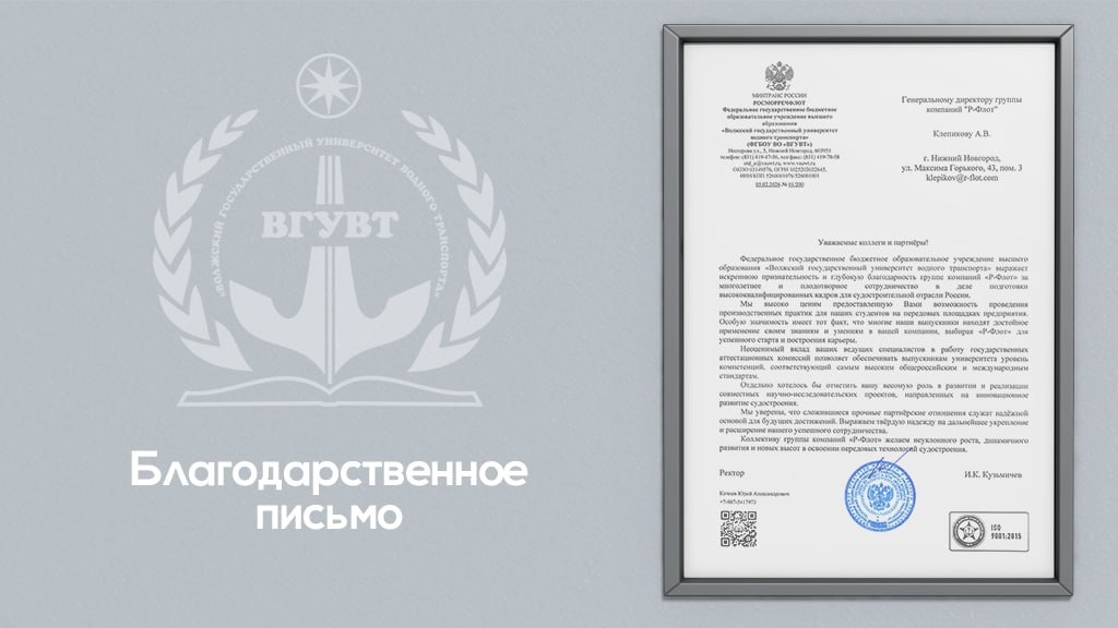 Волжский государственный университет водного транспорта вручил благодарность Группе компаний «Р-Флот» за продолжительное и взаимовыгодное сотрудничество в подготовке кадров и участие в совместных научно-исследовательских проектах.