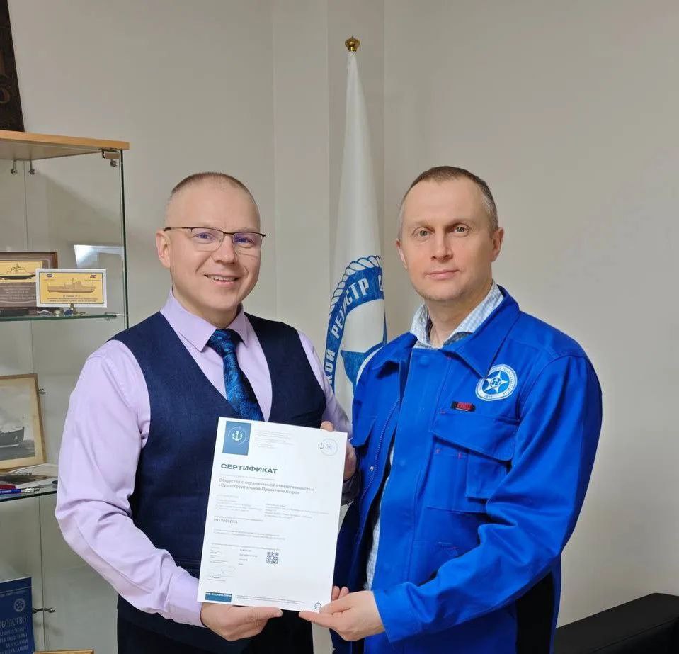 Торжественная церемония вручения сертификата состоялась в офисе компании. Документ генеральному директору «Судостроительного Проектного Бюро» Евгению Олисову передал старший инженер-инспектор Балтийского филиала РС Иван Марков.