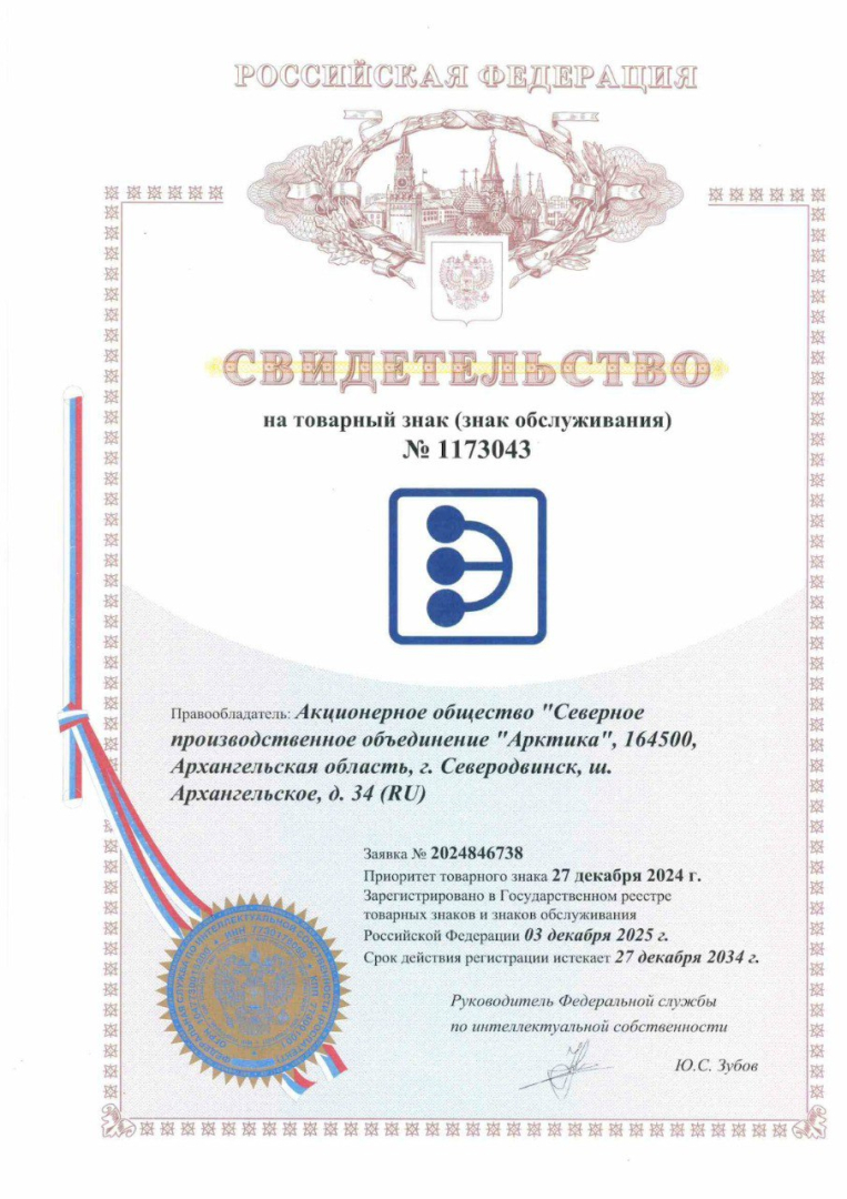 АО «СПО «Арктика» (входит в ОСК) получило свидетельство Федеральной службы по интеллектуальной собственности (Роспатент) о государственной регистрации нового товарного знака (знака обслуживания).