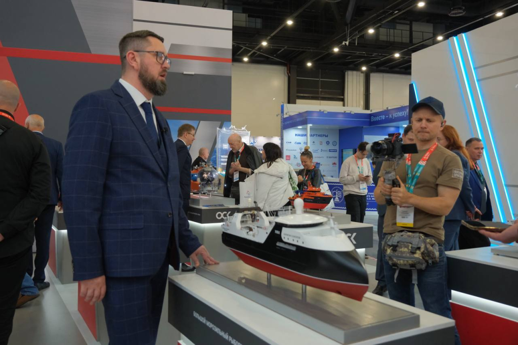 Временно исполняющий обязанности Генерального директора судостроительного завода ОСК "Северная верфь" Василий Волегов на выставке "НЕВА 2025" представил журналистам большой морозильный рыбопромысловый траулер проекта 170701 "Капитан Соколов".