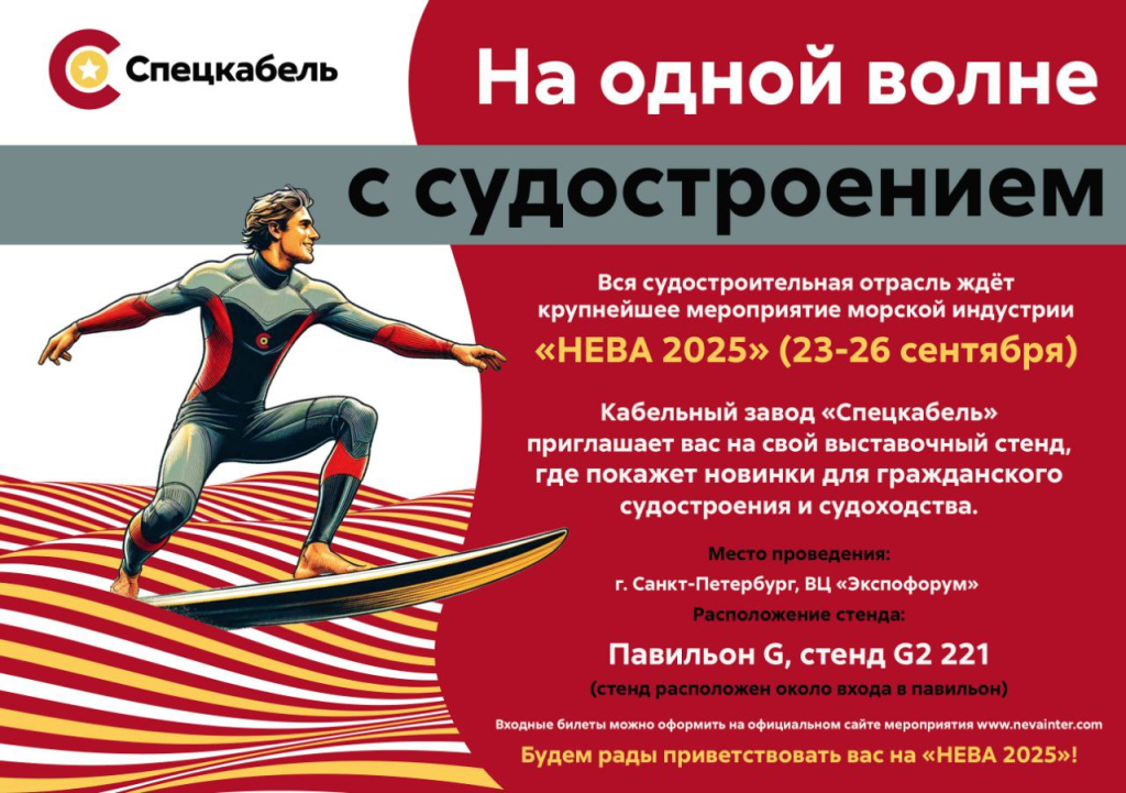 Будем рады видеть вас на выставке "НЕВА"! Стенд "Спецкабеля" расположен в павильоне G, прямо возле входа, под номером G2 221. Главный опознавательный знак – большая фигура серфера, бесстрашно "покоряющего" волны кабельной промышленности, сообщает "Спецкабель".