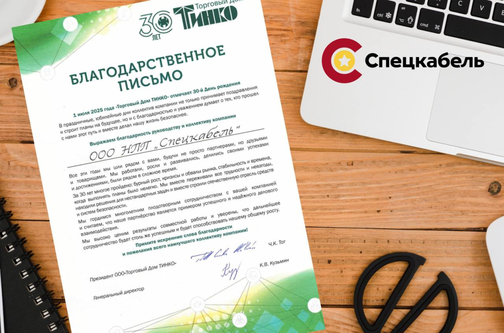 В адрес "Спецкабеля" поступила благодарность от партнера и дилера — торгового дома "ТИНКО", отметившего в июле 30-летие.
