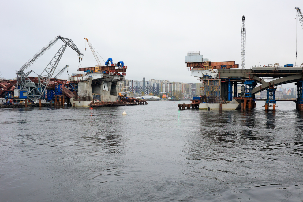 Сейчас строители готовятся к ключевому этапу — установке разводного пролета, состоящего из двух 400-тонных "крыльев". Конструкции уже собраны на левом берегу Невы, на опорах смонтированы гидроцилиндры, изготовленные Обуховским заводом.
