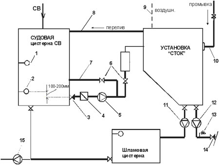 Ниже приведена принципиальная схема привязки установки "СТОК". Выделенными линиями показаны вновь монтируемые трубопроводы. Непременным условием является наличие на судне сборной цистерны сточных вод, т.к. автоматическая работа установки обеспечивается от датчиков уровня, врезанных в цистерну, а подающий насос должен быть отрегулирован на требуемую производительность.