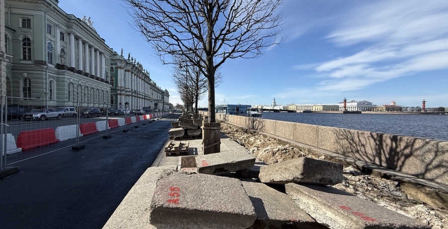 10 апреля начался ремонт Дворцовой набережной на участке от Эрмитажного до Дворцового моста. Здесь приступили к демонтажу гранитных плит тротуара — их отреставрируют и вернут на место. Первый этап работ проводится на участке от Эрмитажного моста до Дворцовой пристани, второй этап (с 1 июля по 15 октября) охватит оставшийся отрезок до Дворцового моста.