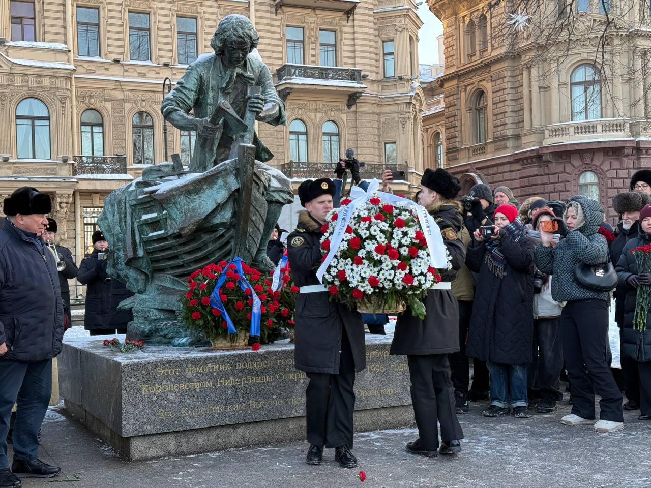 Церемония завершилась возложением цветов к памятнику Петру Великому, сообщает Telegram-канал Морской совет при Правительстве Санкт-Петербурга.