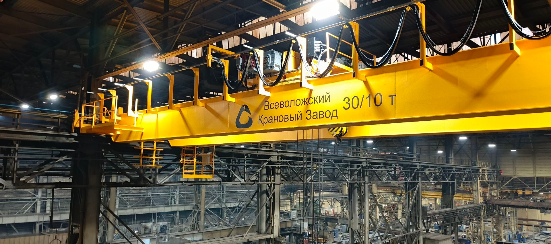 Два двухбалочных мостовых крана с кабиной, грузоподъемностью 30/10т смонтированы в цеху судостроительного завода в Ленобласти.