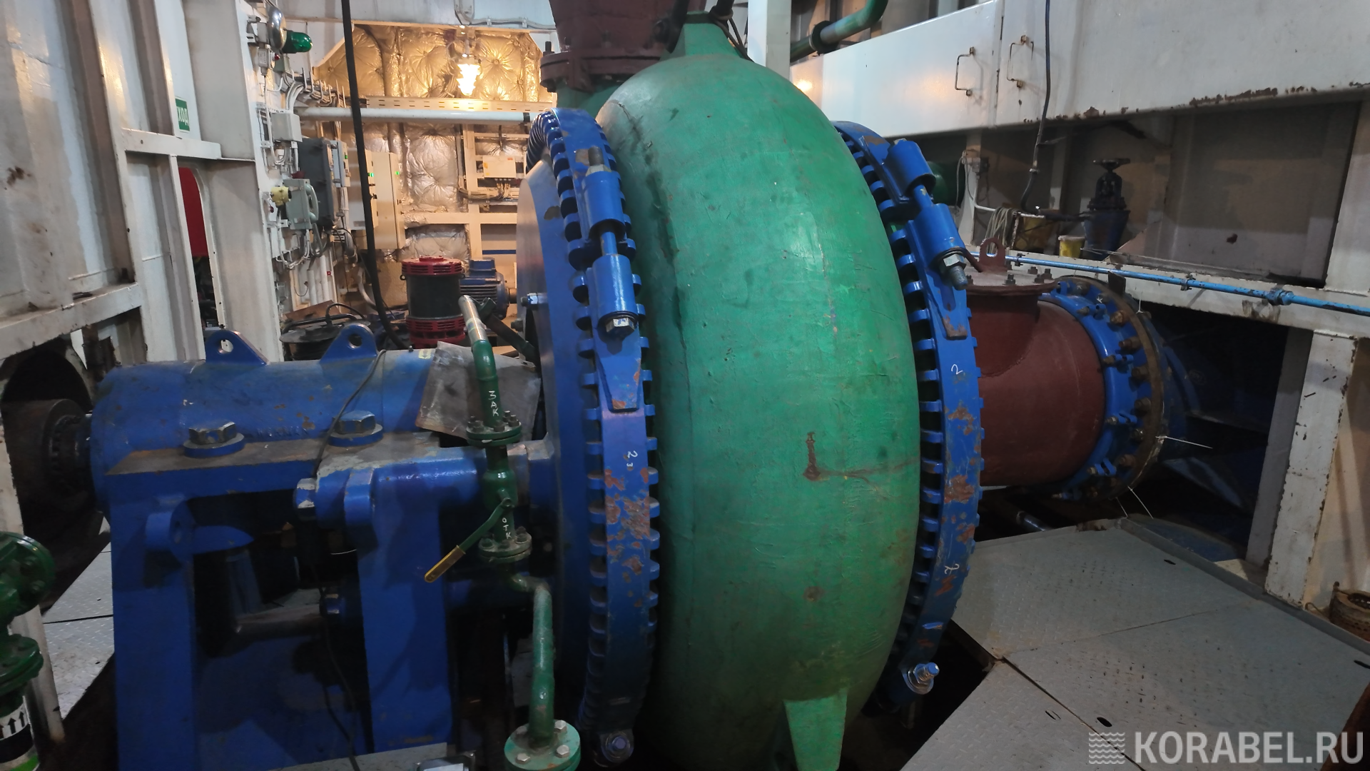 Отличается от стандартного машинного отделения самоходного судна тем, что сердце земснаряда — привод грунтового насоса, который подает пульпу в сортировочно-обогатительный комплекс.