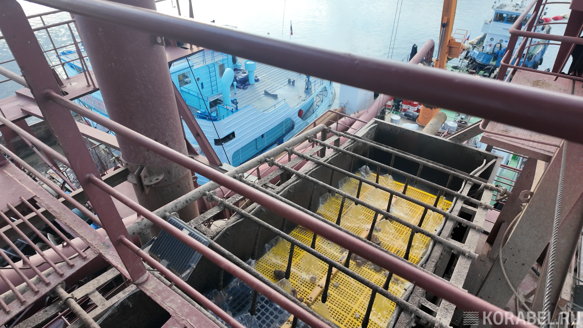 Ключевое на палубе — сортировочно-обогатительный комплекс. Именно благодаря ему пульпа, попадающая на судно, сортируется, разделяется на фракции, а после отгружается на баржи.